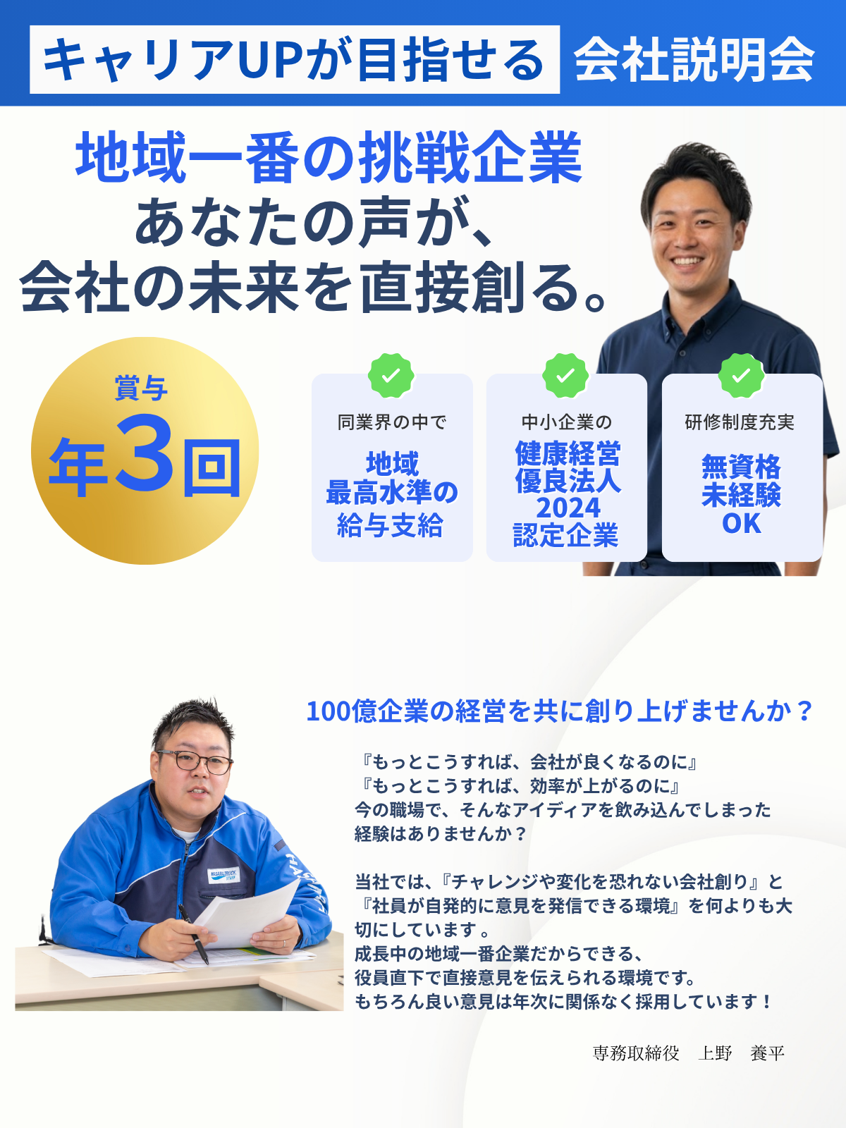 社長を筆頭に、新しい物流センターを建設するプロジェクトの遂行や従業員のための最新設備の車両導入など、成長中の地域一番企業だからこそ裁量権をもって働けます。
